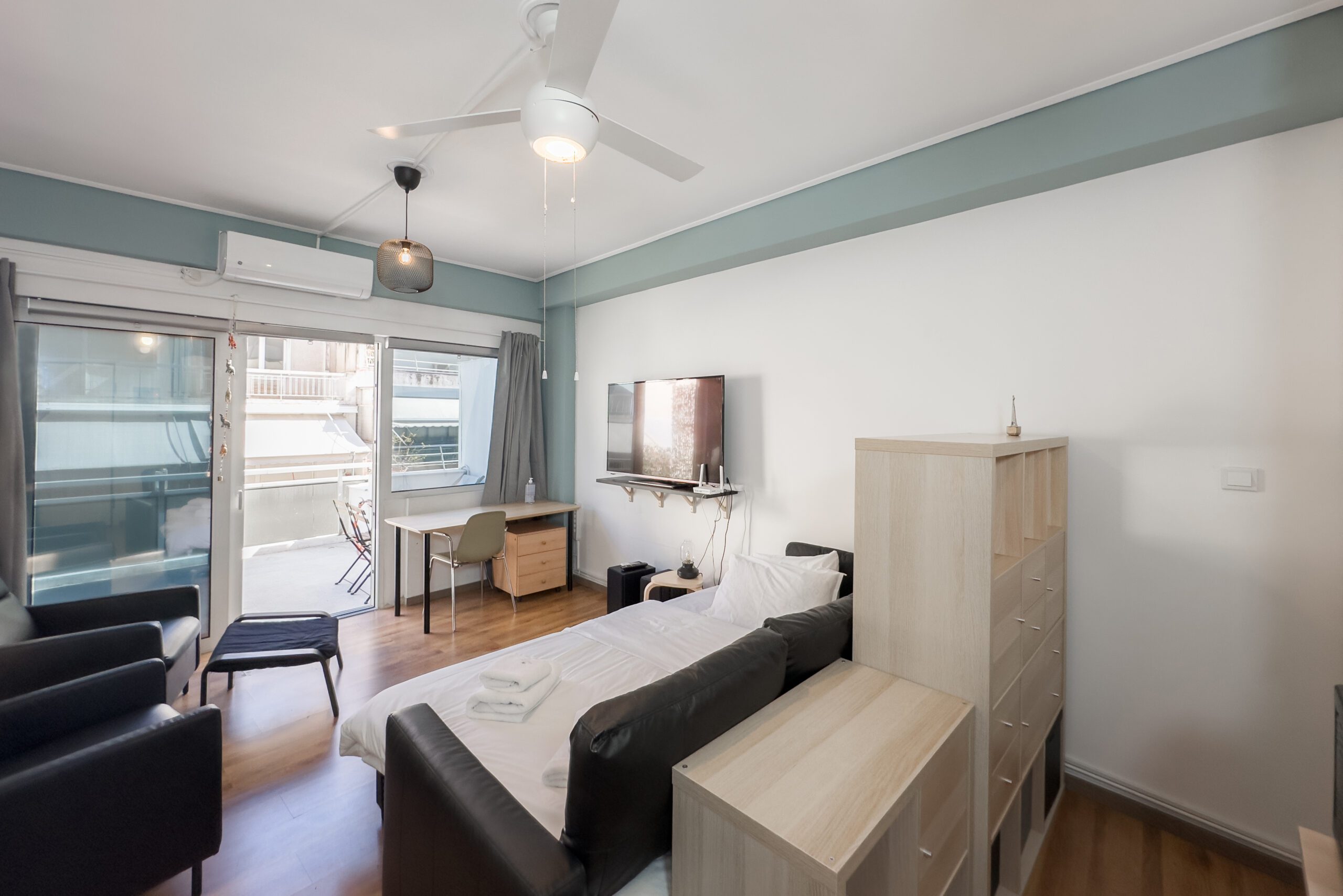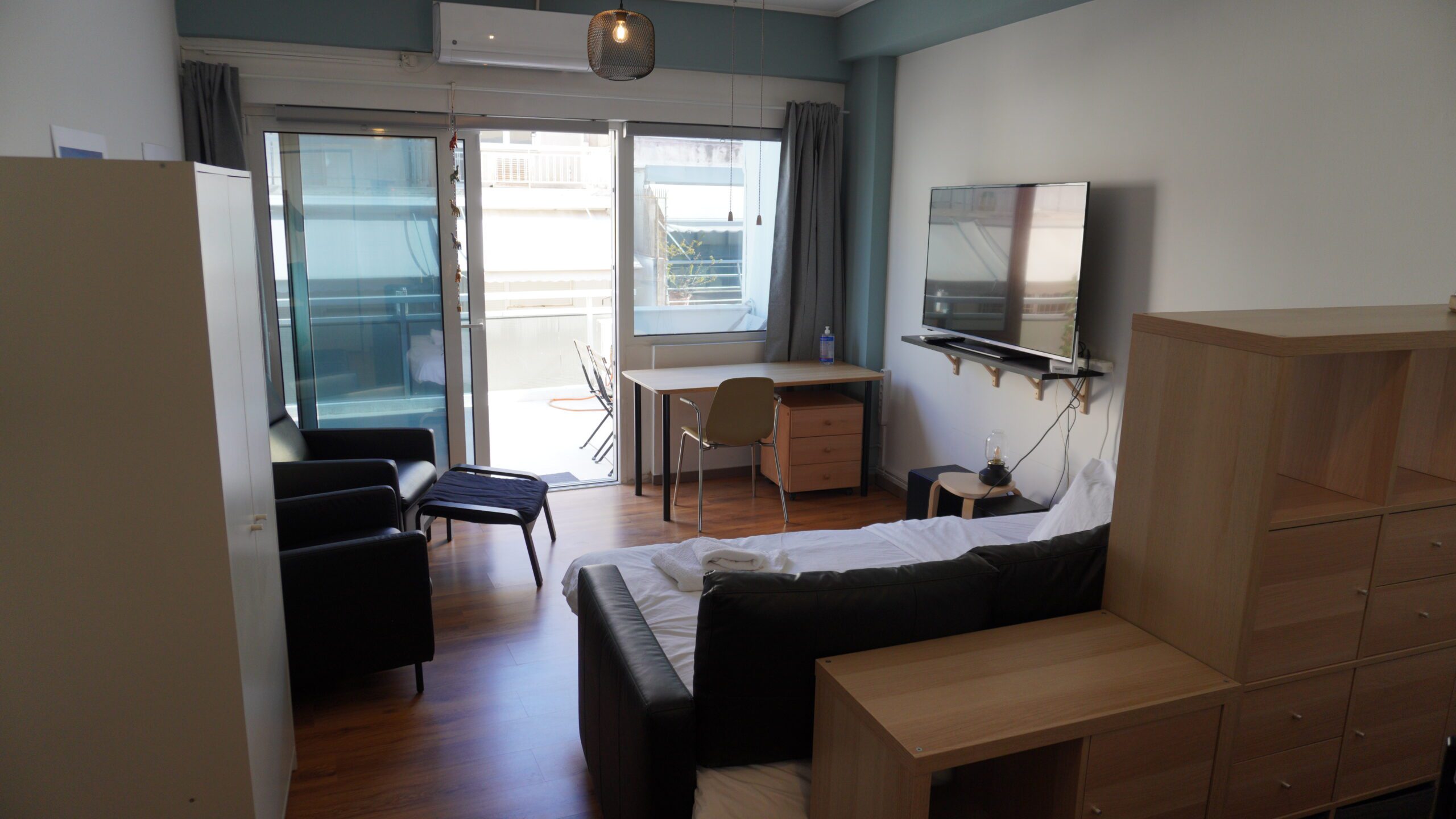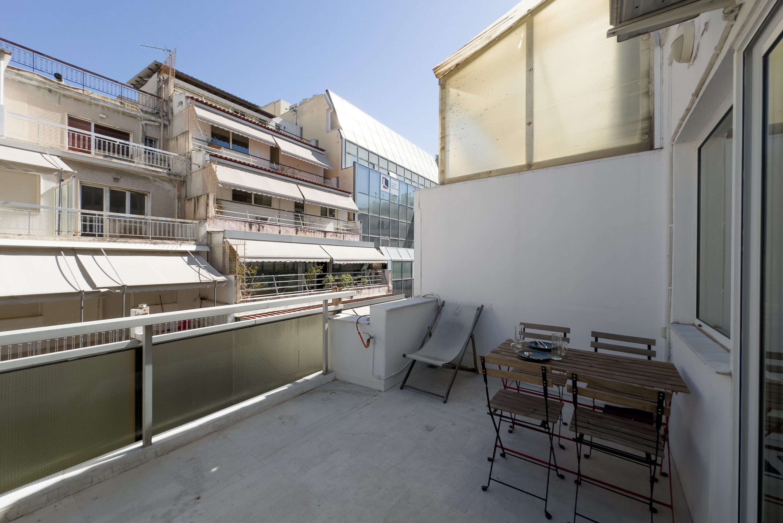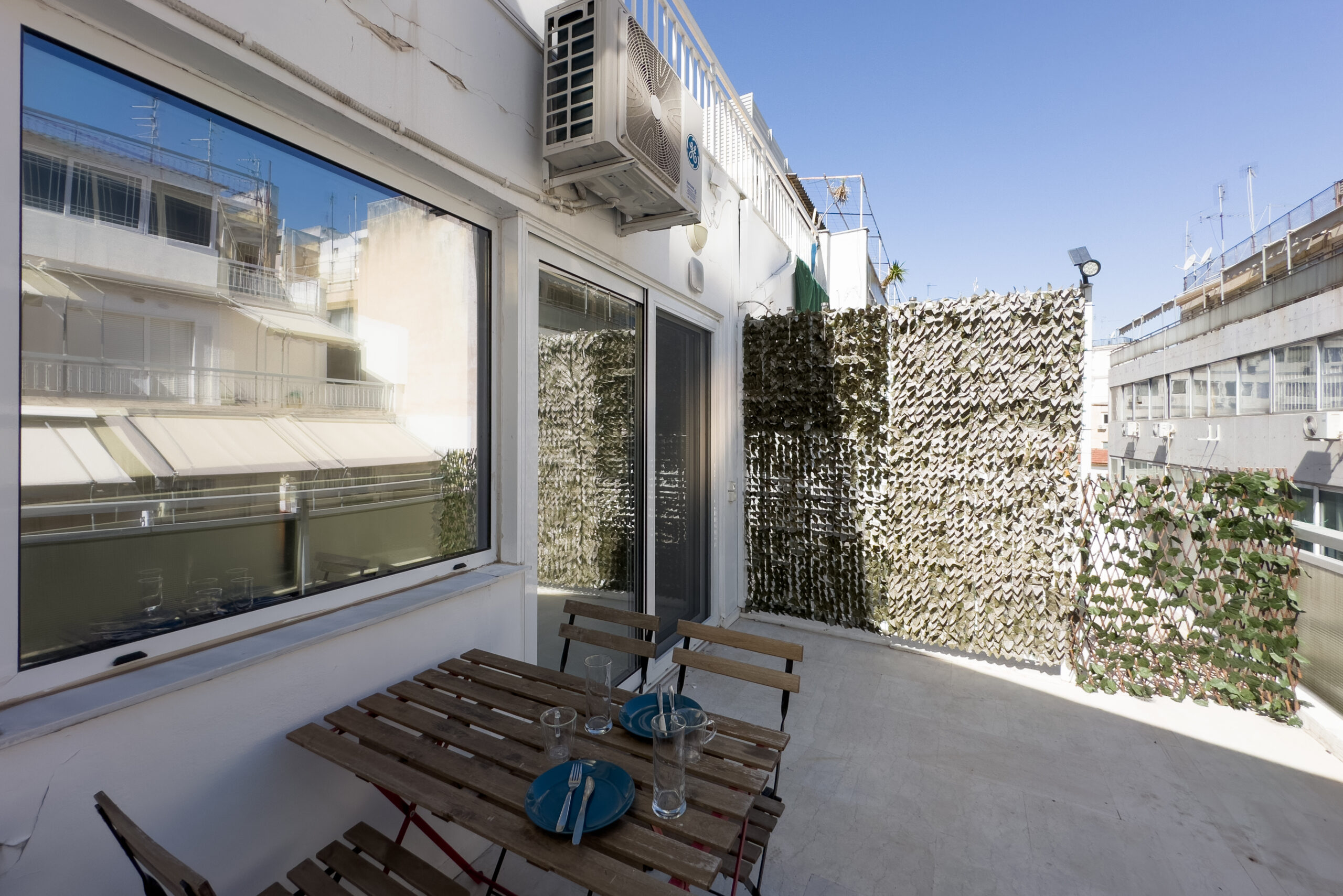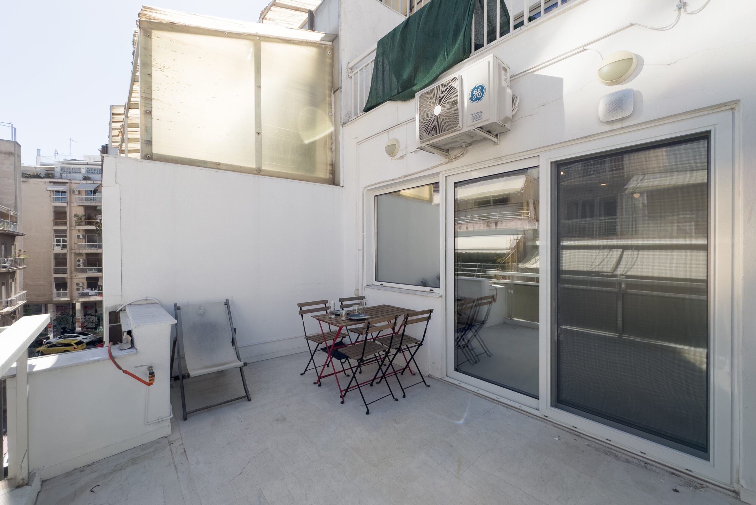 Το στούντιο διαθέτει ένα ευρύχωρο μπαλκόνι με θέα στην πόλη, προσφέροντας το ιδανικό μέρος για να απολαύσετε τα αξιοθέατα και τους ήχους της πόλης. Είτε απολαμβάνετε τον πρωινό σας καφέ καθώς ο ήλιος ανατέλλει πάνω από την Αθήνα, είτε χαλαρώνετε με ένα ποτήρι κρασί καθώς τα φώτα της πόλης λαμπυρίζουν κάτω, το μπαλκόνι μας είναι το τέλειο μέρος για χαλάρωση και να απολαύσετε την έντονη ενέργεια των Εξαρχείων.